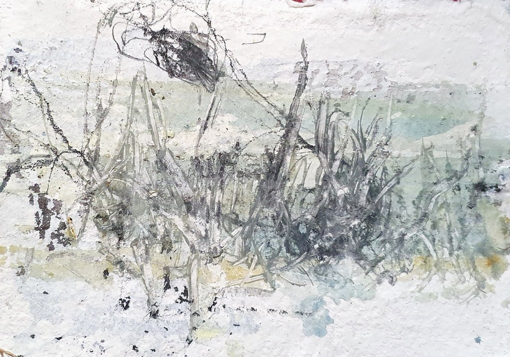 So entstehen keine fertigen „Gemälde“ im traditionellen Sinn – es geht um Momentaufnahmen, um Fließendes. Festgehalten in Skizzenbüchern, auf Servietten, Papptellern, im Sand – von Zeit zu Zeit auf tollen Papieren, die wiederum eine (ästhetische) Welt für sich sind.